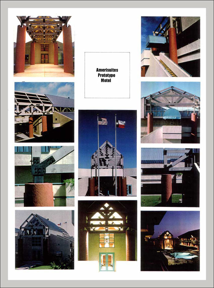 Amerisuites hotel in Amarillo, Texas (shown here) is one of 15 such projects built in the Southwest. They were designed with the idea of creating a strong sense of arrival and identity lacking from most accommodations of this kind. The front courtyard, located between the reception/breakfast area and the property boundary, as well as an overdesigned partially covered trellis, are the strongest components of the initial experience for the visitor and the main elements of the entry sequence. They are the exterior design's major welcoming gesture and a suggestion of a more domestic place to stay, greatly complimented by the design of the interior.